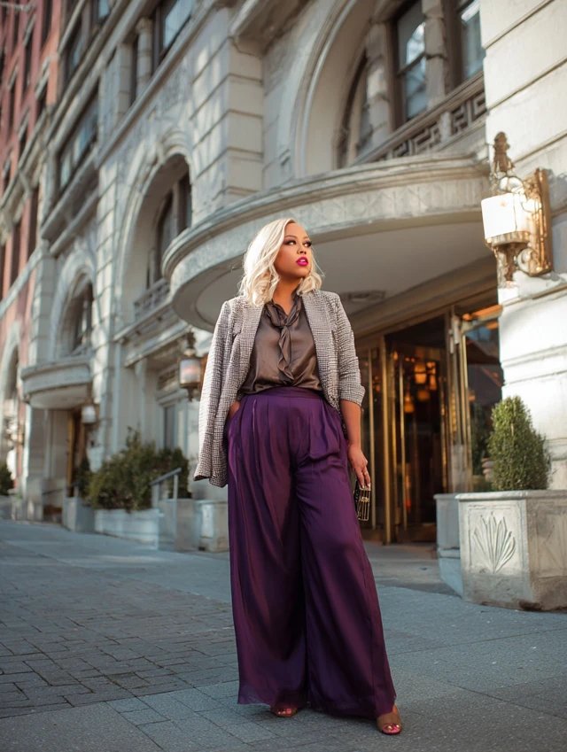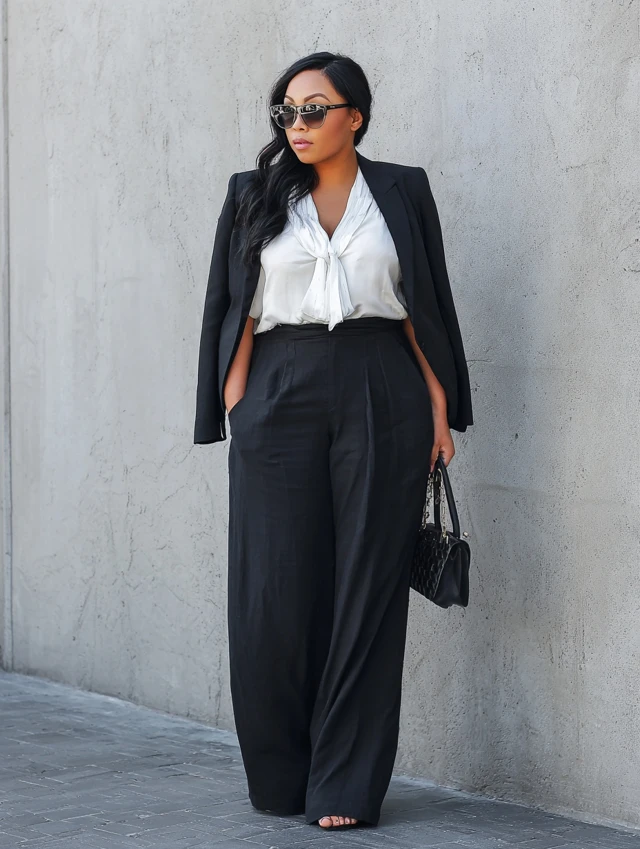 4. Wide-Leg Trousers + Silk Blouse + Blazer