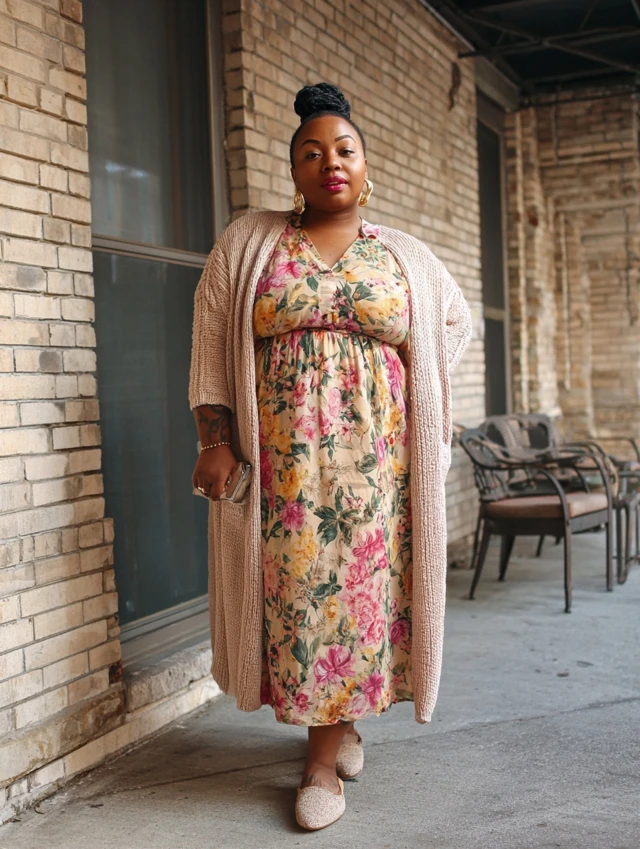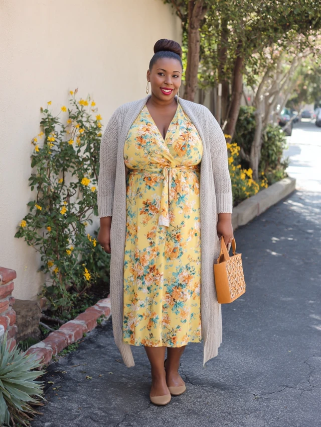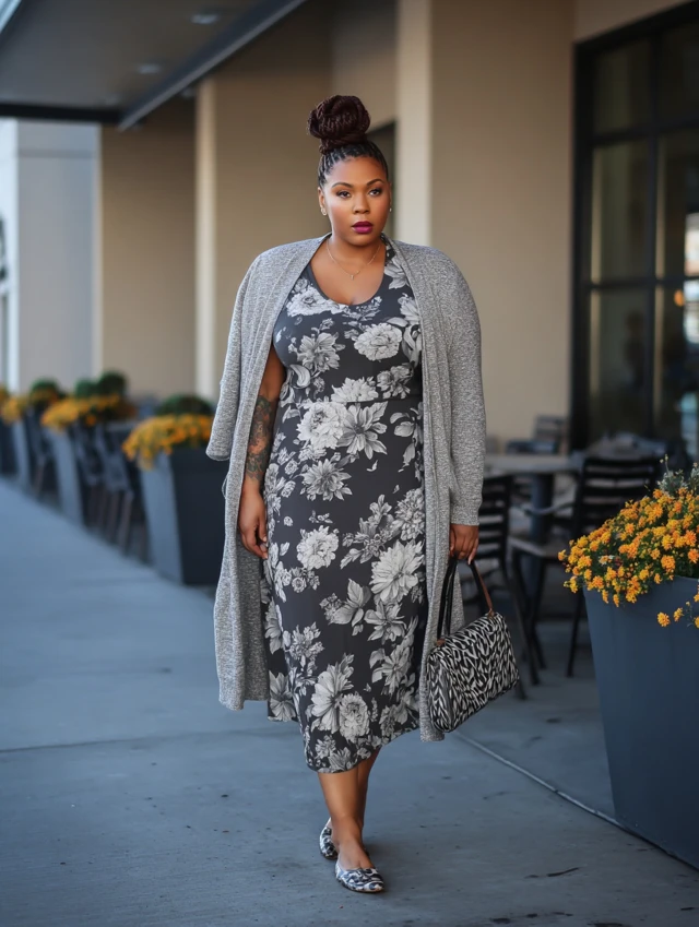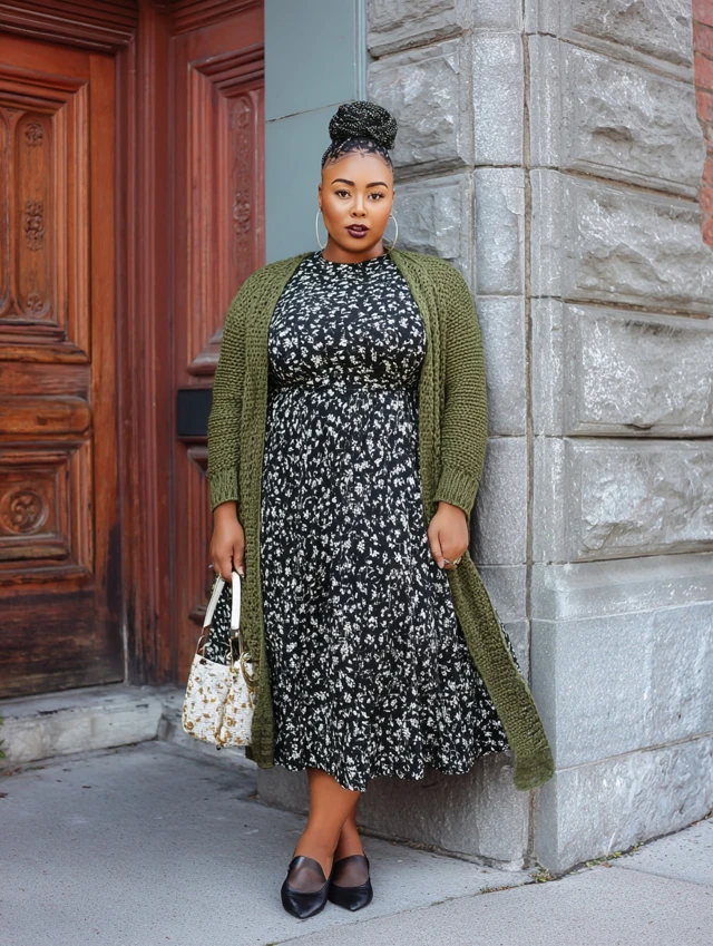 1. Midi Dress + Long Cardigan + Flats